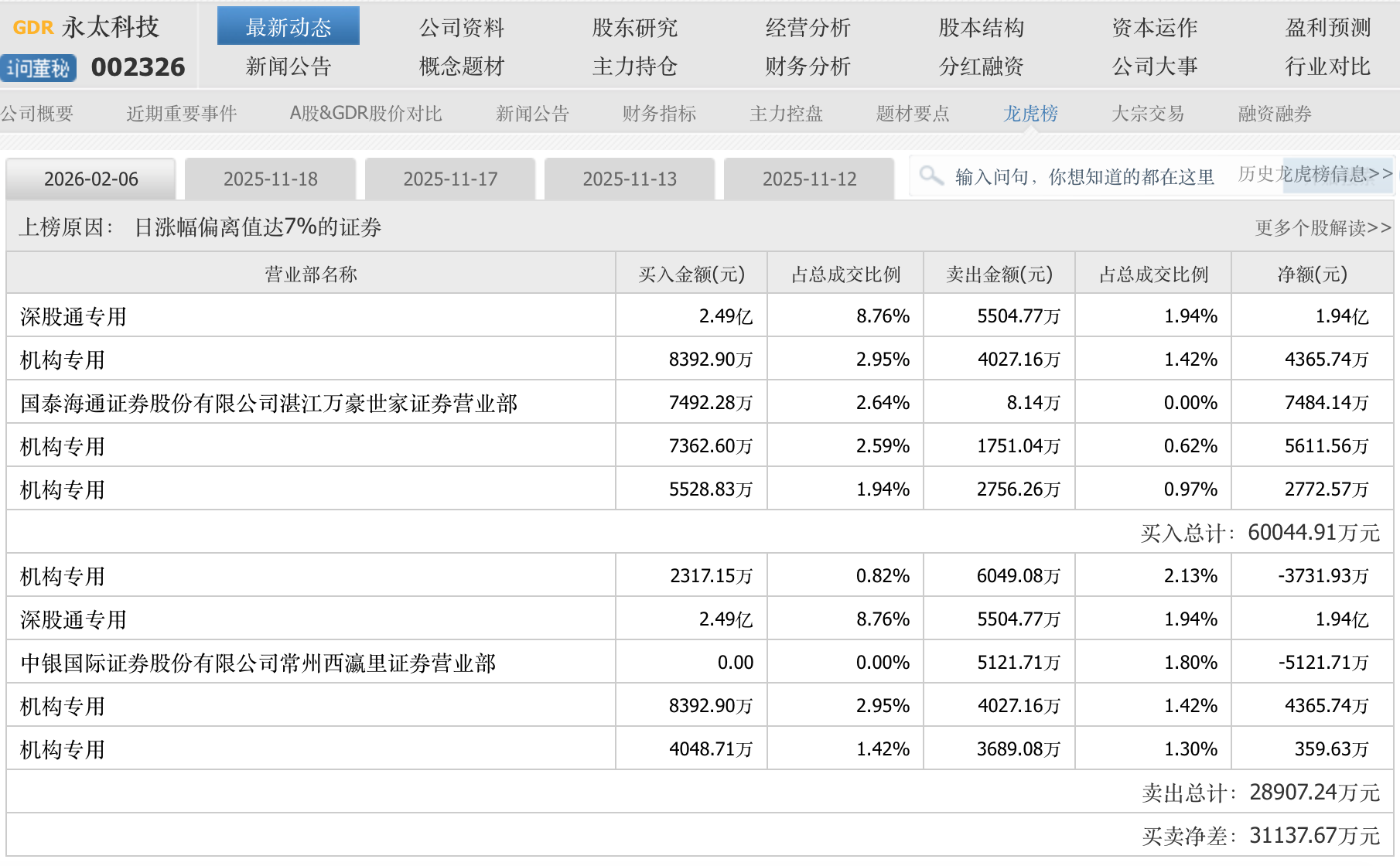 盘面显示,在永太科技停牌前的最后一个交易日(2月6日),公司股价在深成指微跌0.33%的背景下,逆市强势涨停,表现异常抢眼。龙虎榜数据显示,“深股通专用”席位当日大举买入2.49亿元,高居买入榜首,买卖前五席位资金净流入高达3.11亿元。这种“先知先觉”的资金异动,是否是永太科技在终止重组公告中提及的“外部因素”之一。