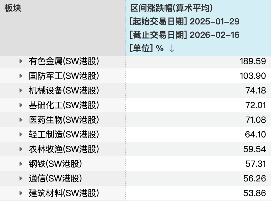 蛇年港股人工智能、有色金属、创新药等板块领涨,大市值行业龙头股价涨幅较大。华虹半导体上涨337.20%、中国人寿上涨143.70%、中芯国际上涨83.95%、阿里巴巴-W上涨78.14%,汇丰控股上涨77.30%、腾讯控股上涨34.01%。