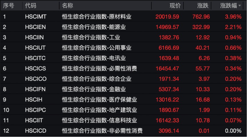 恒生综合行业指数12个行业全部收涨,原材料业、能源业、工业涨幅居前,分别上涨3.96%、2.21%、0.94%。