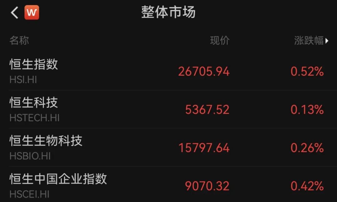 Wind数据显示,截至收盘,恒生指数涨0.52%,恒生中国企业指数涨0.42%,恒生科技指数涨0.13%。
