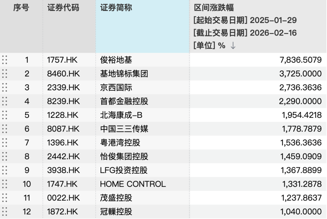 Wind数据显示,蛇年(2025年1月29日至2026年2月16日)恒生指数涨幅达32.04%,恒生国企指数涨幅达22.87%,恒生科技指数涨幅达13.63%。涨幅排名前三的个股分别为俊裕地基、基地锦标集团、京西国际。