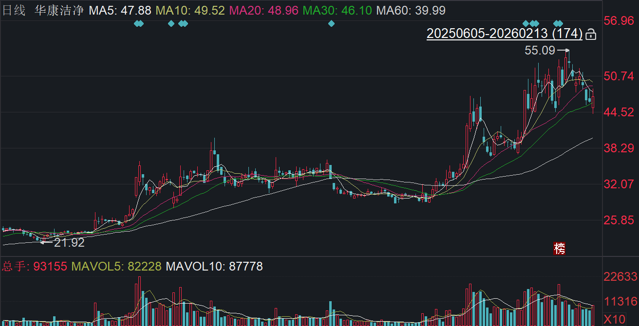 二级市场上,截至2月13日收盘,华康洁净上涨2.01%报47.13元/股,总市值约50.80亿元,近一年来累计上涨约130%。