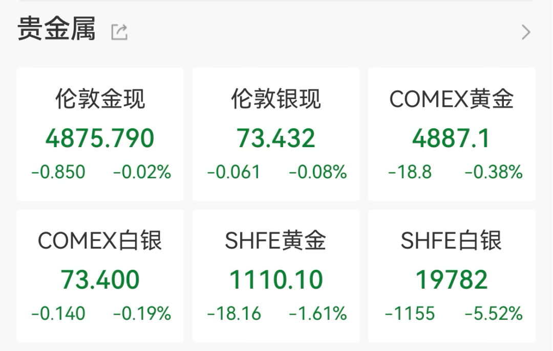 现货黄金跌2.33%,报4878.89美元/盎司。现货白银跌4.16%,报73.50美元/盎司。