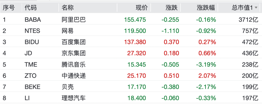 中概股涨跌互现,纳斯达克中国金龙指数跌0.1%。热门中概股方面,中通快递涨超2%,腾讯音乐跌超3%,贝壳跌超2%,阿里巴巴、网易、理想汽车下跌,京东集团、百度集团等上涨。