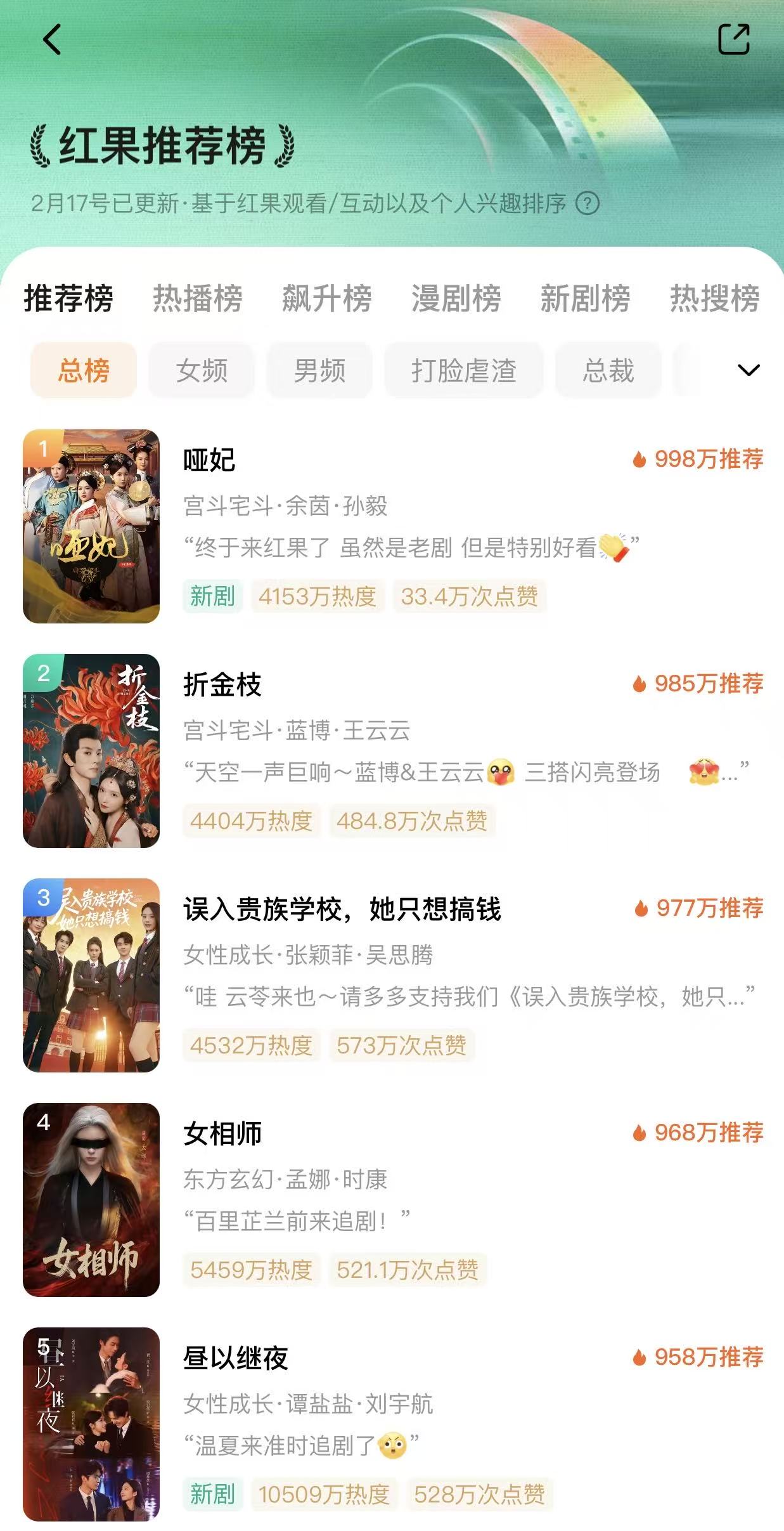 根据2026年2月中旬的数据,目前最火的短剧主要集中在红果、抖音、快手等平台,题材涵盖都市、春运、古装等。在红果上,《昼以继夜》开播后迅速空降热度榜TOP1,热度值突破1亿。该剧由谭盐盐和刘宇航主演,是一部都市女性群像剧。快手上,《春运回家路之绝地反杀》紧贴春节返乡场景的春运题材短剧,播出后实现付费和免费榜单双爆,播放增量高达9769.7万。