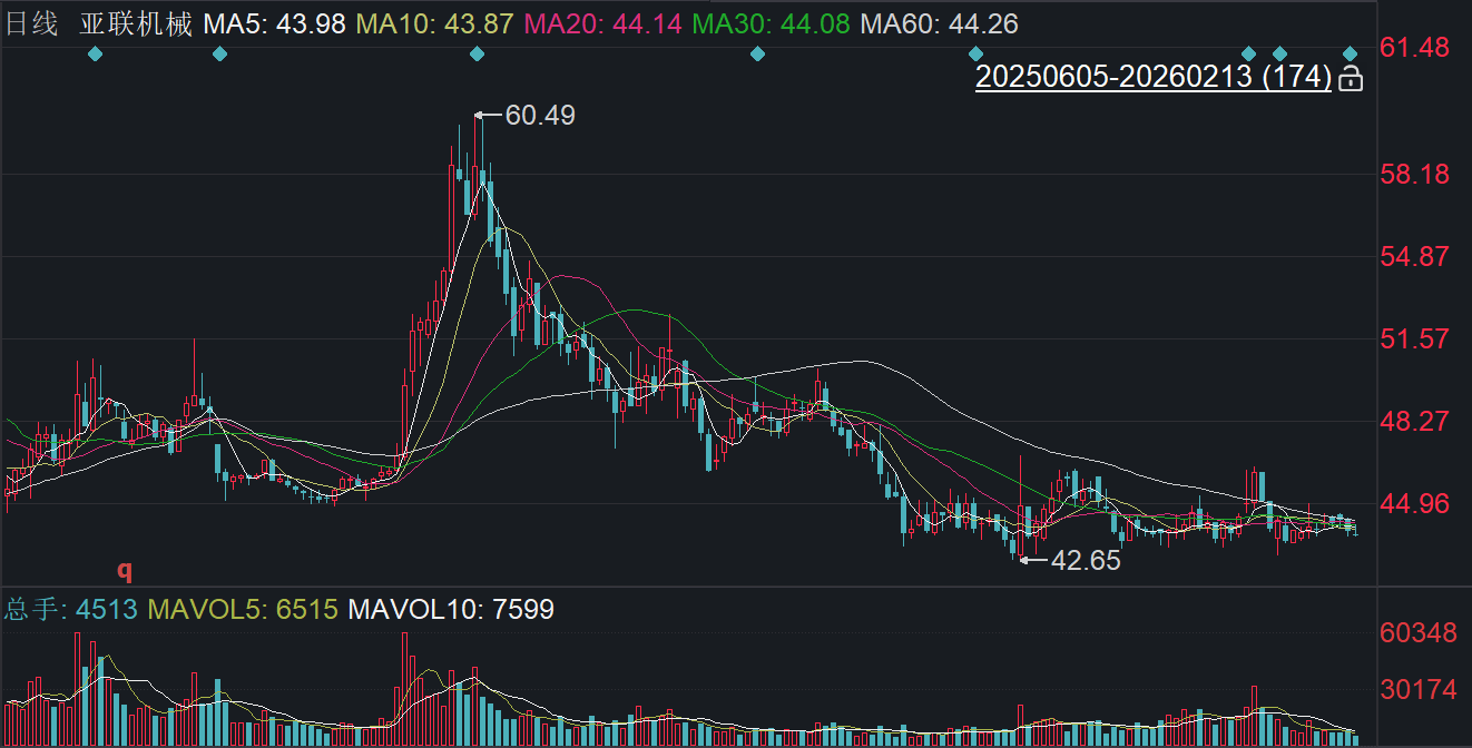 二级市场上,截至2月13日收盘,亚联机械下跌0.34%报43.65元/股,总市值约38.08亿元,上市以来累计上涨约132%,但较2025年8月的高位跌超两成,股价如“过山车”。