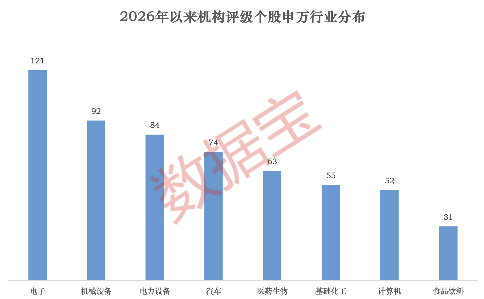 从行业上看,机构评级个股主要分布于电子、机械设备、电力设备行业,上榜个股数量依次为121只、92只、84只;汽车、医药生物、基础化工、计算机等紧随其后,获评级个股数量均在50只以上。
