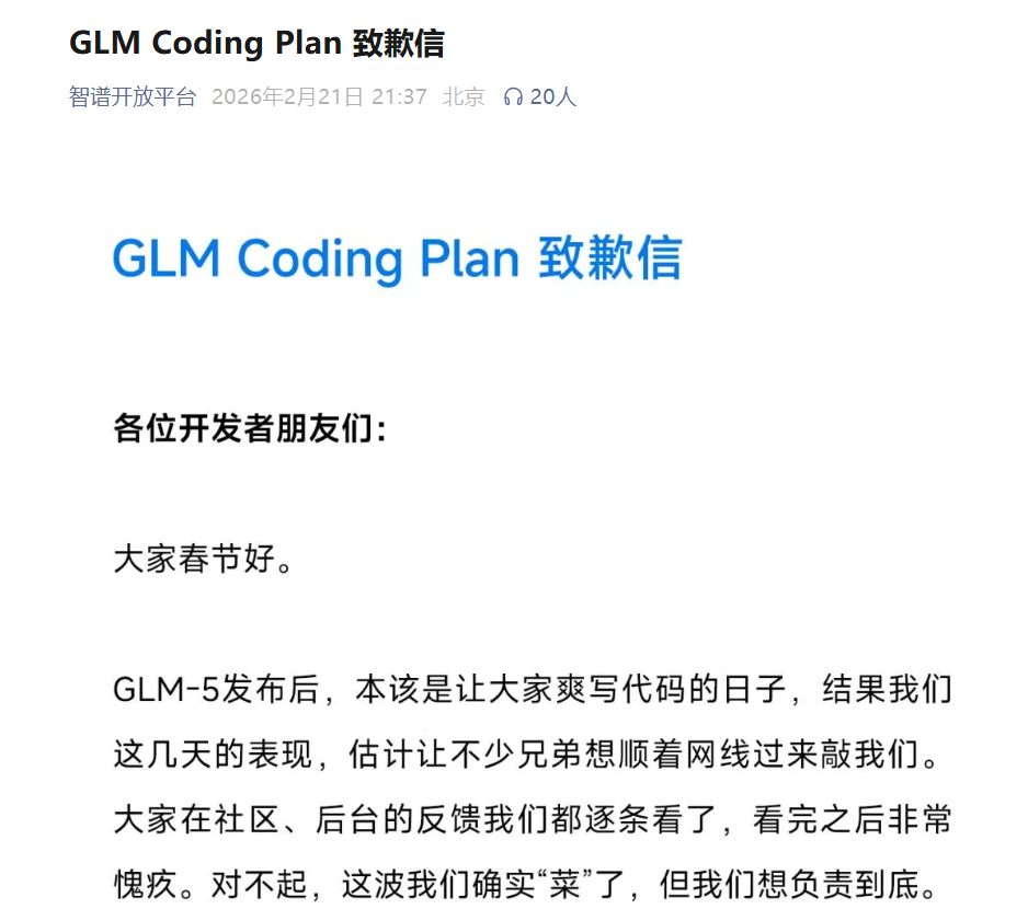 【大河财立方消息】2月21日,“全球大模型第一股”智谱AI(02513.HK)发文致歉,表达其旗舰模型GLM-5发布后遭遇的运营困境。值得注意的是,2月20日,智谱AI股价暴涨42.72%,市值突破3200亿港元。