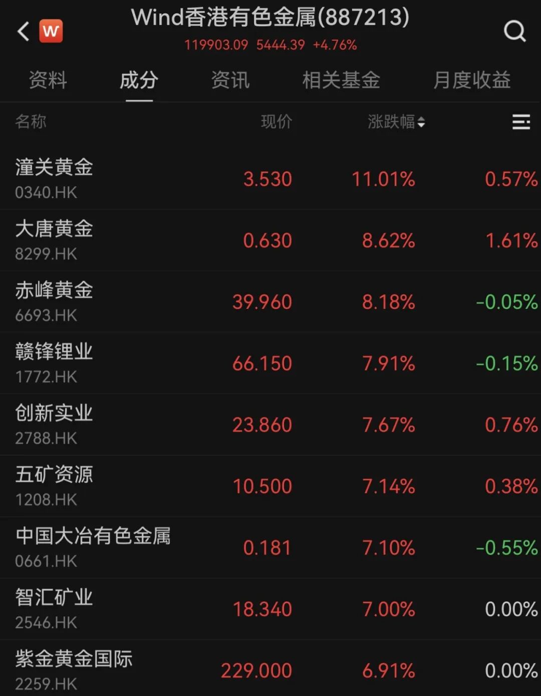 有色金属板块表现强势,万得香港有色金属指数半日涨4.76%。成分股中,潼关黄金大涨11.01%,大唐黄金、赤峰黄金涨超8%,赣锋锂业、创新实业、五矿资源等涨超7%。