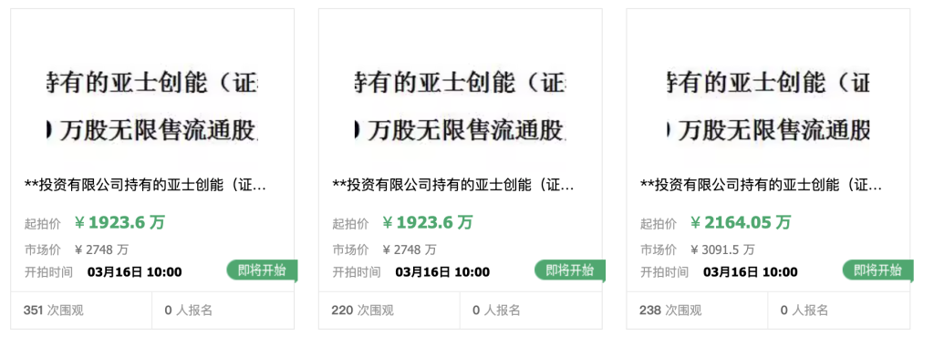 截至本公告披露日,创能明合计持有亚士创能7865.55万股股份,占公司总股本的18.35%。亚士创能在公告中称,本次拍卖事项不会影响公司的生产经营,也不会导致公司股权分布不具备上市条件。