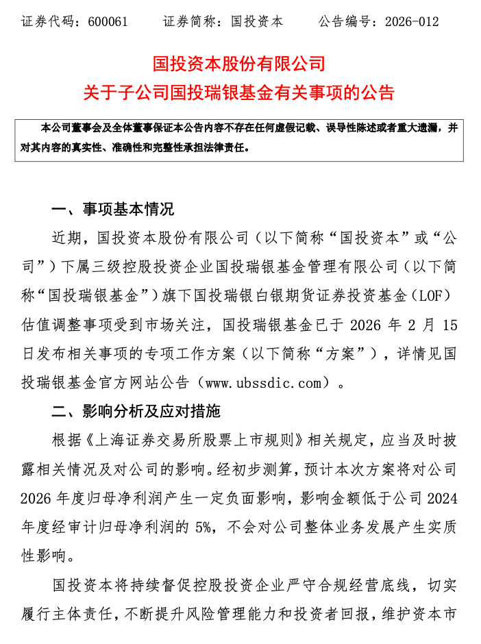 公告披露,公司下属三级控股投资企业国投瑞银基金旗下国投瑞银白银期货证券投资基金(LOF)(下称“国投白银LOF”)估值调整事项受到市场关注,国投瑞银基金已于2026年2月15日发布相关事项的专项工作方案。