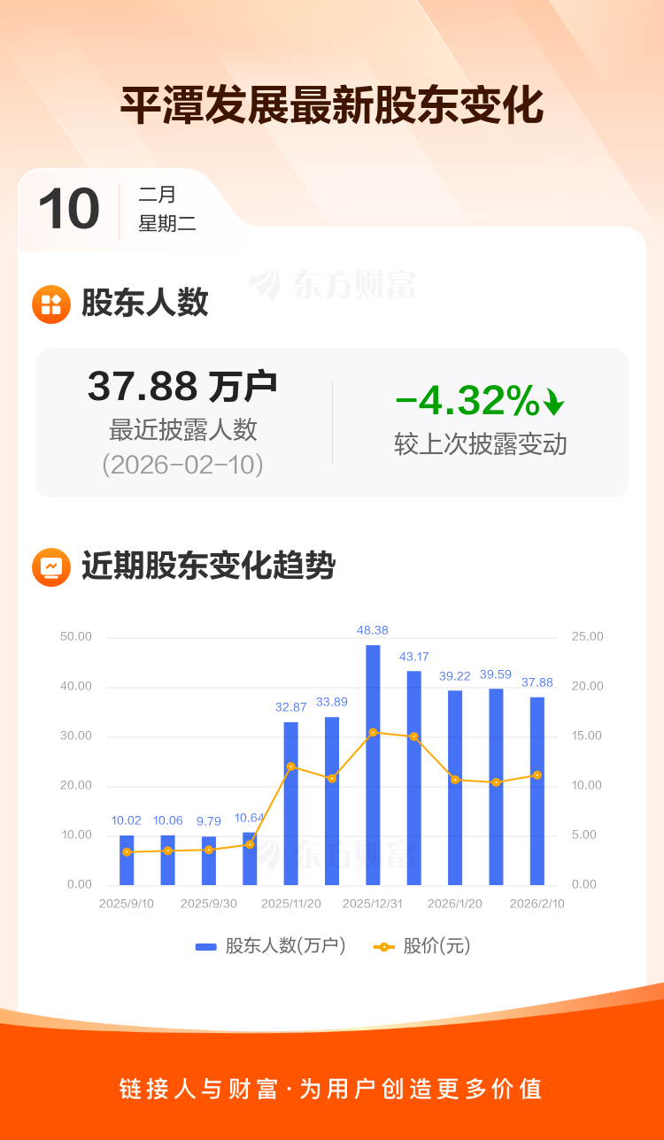 平潭发展最新披露数据显示,截至2月10日公司股东户数为37.88万户,较上期(2026年1月30日)减少1.71万户,降幅为4.32%。户均持有流通股数量由上期的4837股上升至5055股,户均持股金额由上期的5.01万元增加至5.61万元。