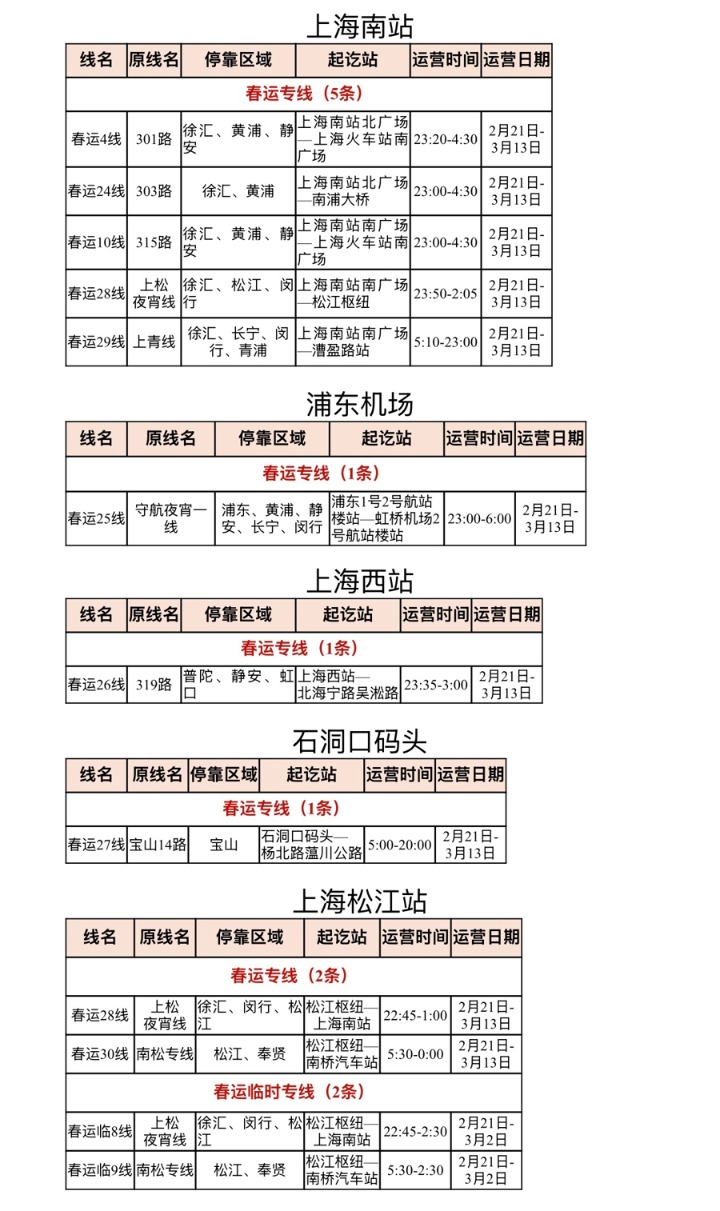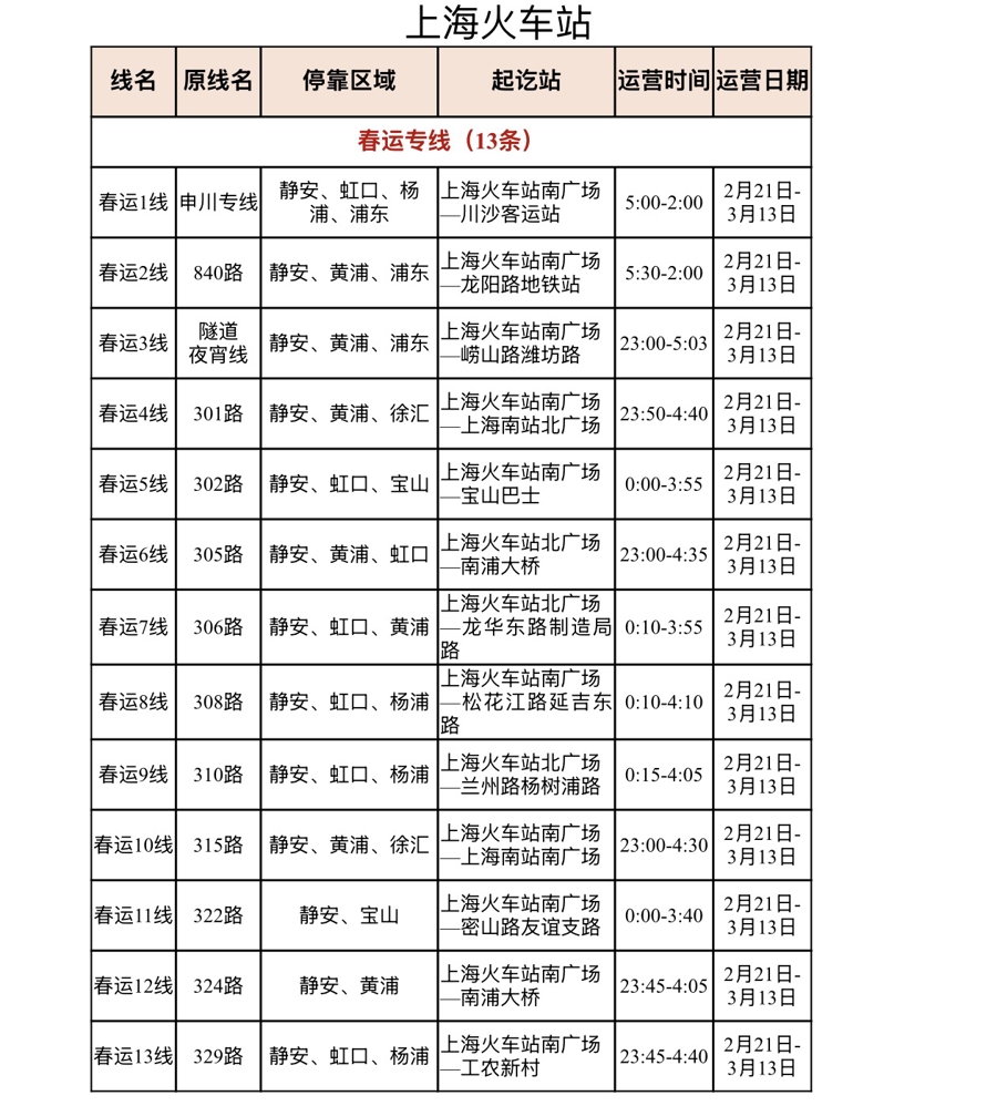 2月23日正值春节假期最后一天,上海迎来春运返程客流高峰。记者从市交通委获悉,为切实保障凌晨抵沪旅客及时疏运,实现地面公交与机场、火车站、码头、轨道交通的高效衔接,本市公交行业自2月21日起,开通了30条春运专线、9条春运临时专线和4条定制公交线路,为返程旅客出行保驾护航,最晚运营至3月13日。
