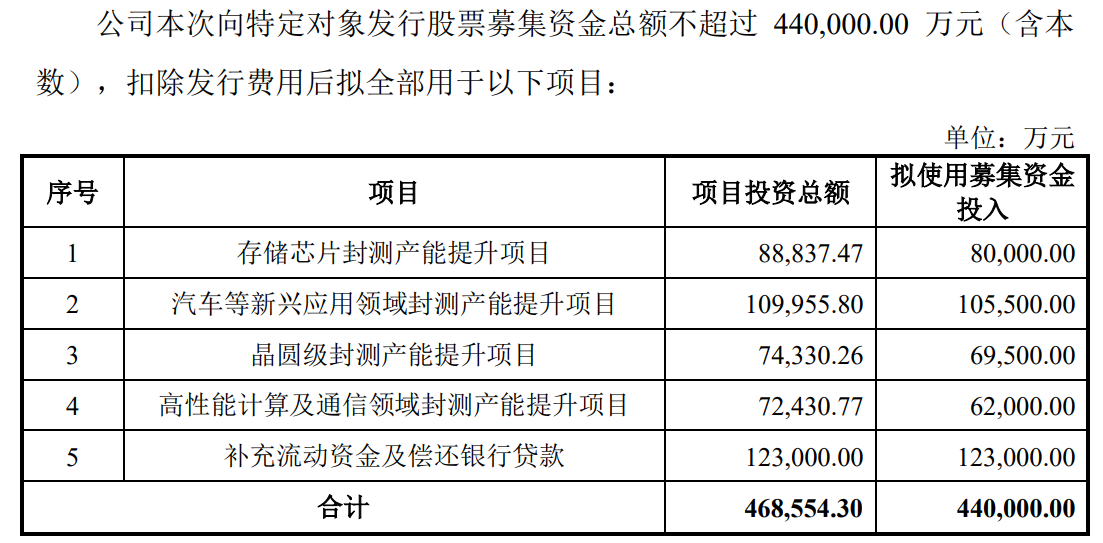 根据公告,通富微电拟向特定对象发行股票,募集资金总额不超过44亿元(含本数),扣除发行费用后拟全部用于存储芯片封测产能提升项目、汽车等新兴应用领域封测产能提升项目、晶圆级封测产能提升项目、高性能计算及通信领域封测产能提升项目、补充流动资金及偿还银行贷款。