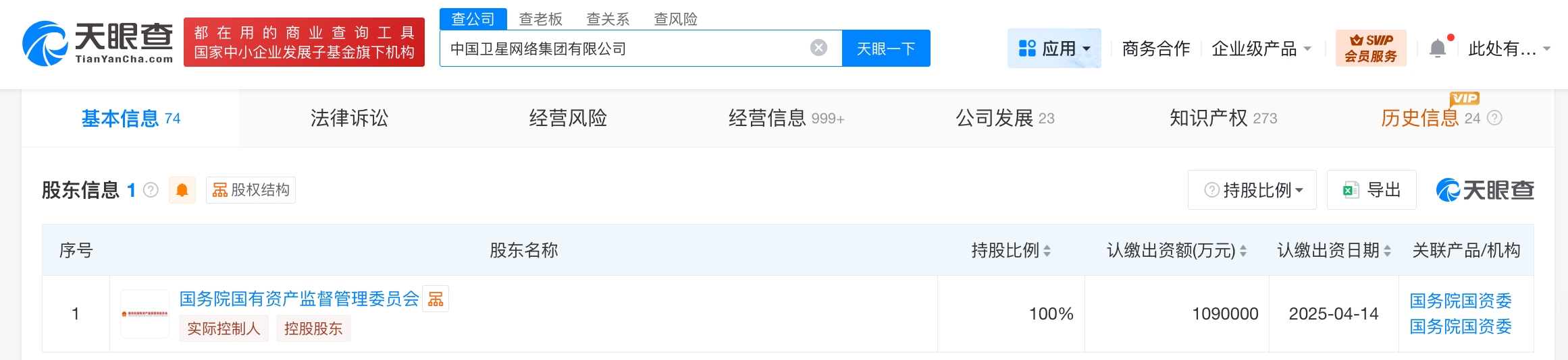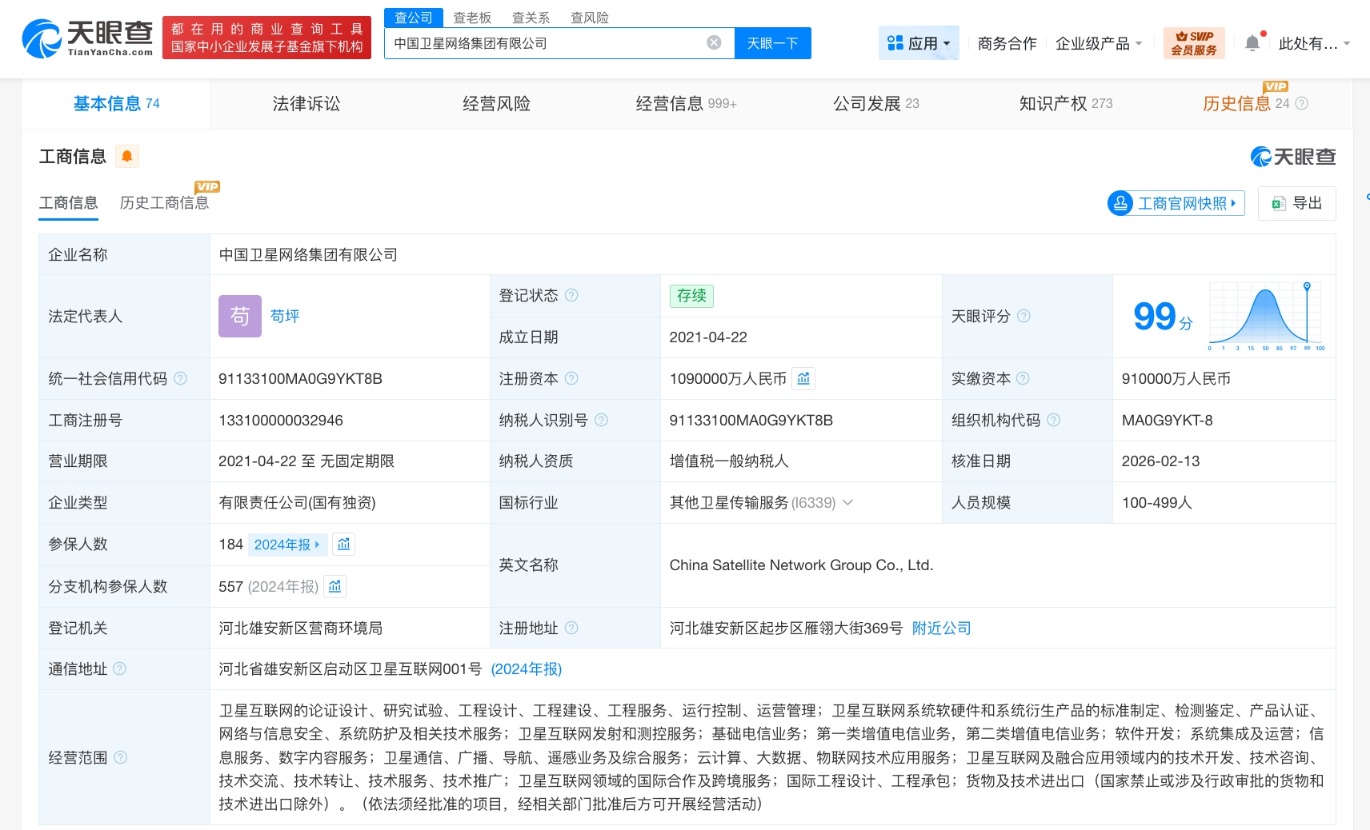 天眼查App显示,近日,中国卫星网络集团有限公司发生工商变更,注册资本由100亿元人民币增至109亿元人民币,增幅9%;同时,部分高管也发生变更。该公司成立于2021年4月,法定代表人为苟坪,经营范围含卫星互联网的论证设计、研究试验、工程设计、工程建设,卫星互联网发射和测控服务,基础电信业务,信息服务,卫星通信、广播、导航、遥感业务及综合服务等。股东信息显示,该公司由国务院国有资产监督管理委员会全资持股。