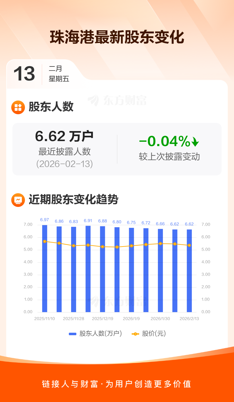珠海港最新披露数据显示,截至2月13日公司股东户数为6.62万户,较上期(2026年2月10日)减少28户,降幅为0.04%。户均持有流通股数量为1.36万股,与上期基本持平,户均持股金额由上期的7.44万元减少至7.29万元。