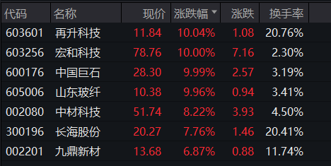 玻璃纤维全天强势,再升科技、宏和科技、中国巨石、山东玻纤等多股涨停。