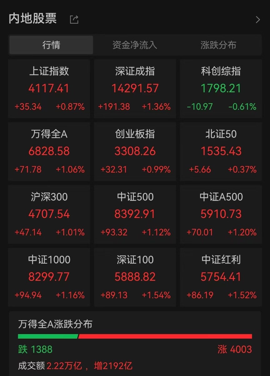 2月24日,A股马年首个交易日收官,市场冲高回落。截至收盘,沪指涨0.87%,深证成指涨1.36%,科创综指跌0.61%,创业板指涨1.06%。沪深北三市成交额2.22万亿元,较上一个交易日放量2192亿元。