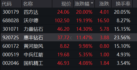 培育钻石午后异动,四方达20cm涨停,黄河旋风涨停,沃尔德、力量钻石、惠丰钻石涨超11%。