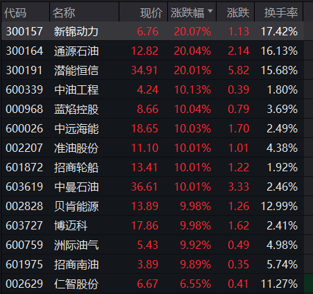 油气开采板块持续走强,新锦动力、通源石油、潜能恒信20CM涨停,中油工程、蓝焰控股、中远海能、准油股份、招商轮船等多股涨停。