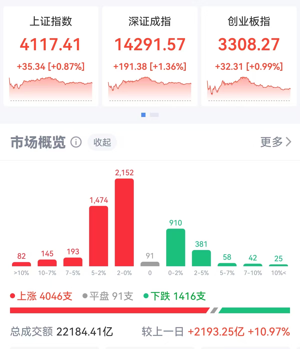 今日,A股迎来马年“开门红”。截至收盘,沪指涨0.87%,收报4117.41点;深证成指涨1.36%,收报14291.57点;创业板指涨0.99%,收报3308.27点。沪深京三市成交额达到22184亿元,较上一交易日放量2193亿元,重回万亿成交区间。
