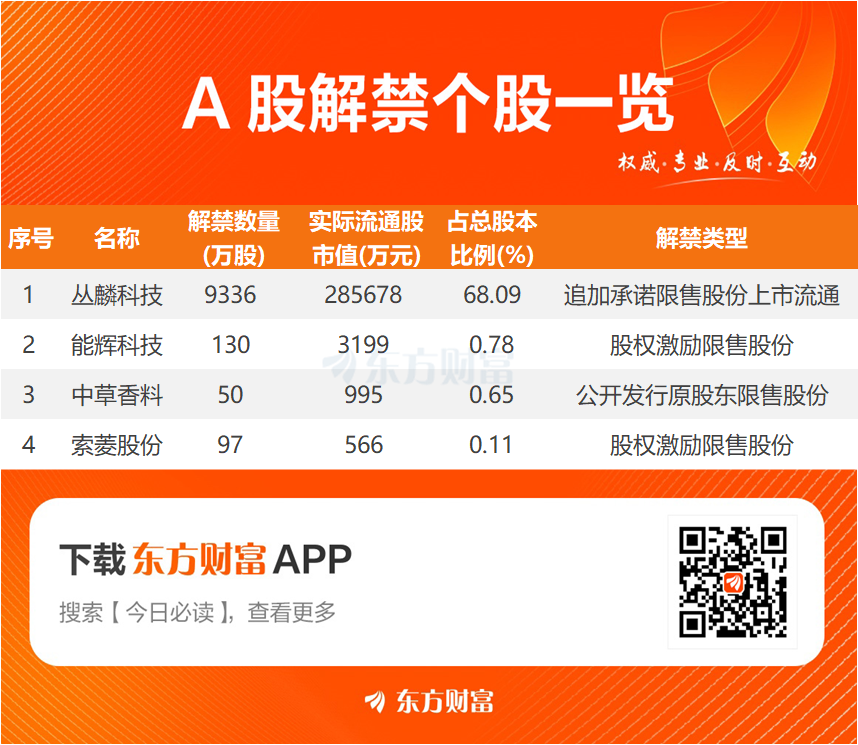 从解禁市值看,东方财富Choice数据显示,明日面临解禁的4只股票中,丛麟科技、能辉科技、中草香料居前,解禁市值分别为28.57亿元、0.32亿元、0.10亿元。解禁比例方面,丛麟科技、能辉科技、中草香料分别为68.09%、0.78%、0.65%,居于前列。