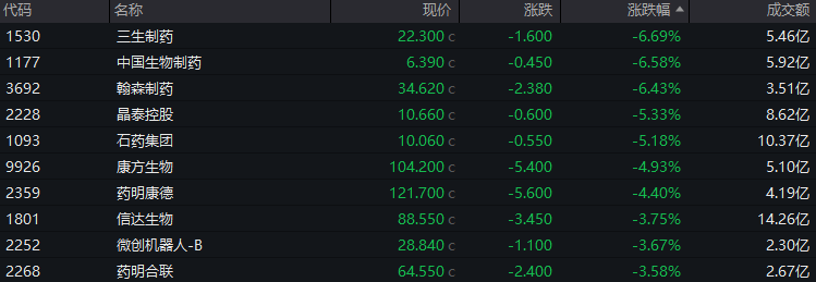 医药板块走弱,泰格医药跌超3.6%,昭衍新药跌7.3%,药明康德、信达生物、阿里健康等均收跌。