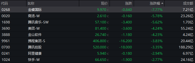 互联网科技股集体走低,阿里巴巴跌2.7%,金山云跌5%,快手、小米等跌逾2%。