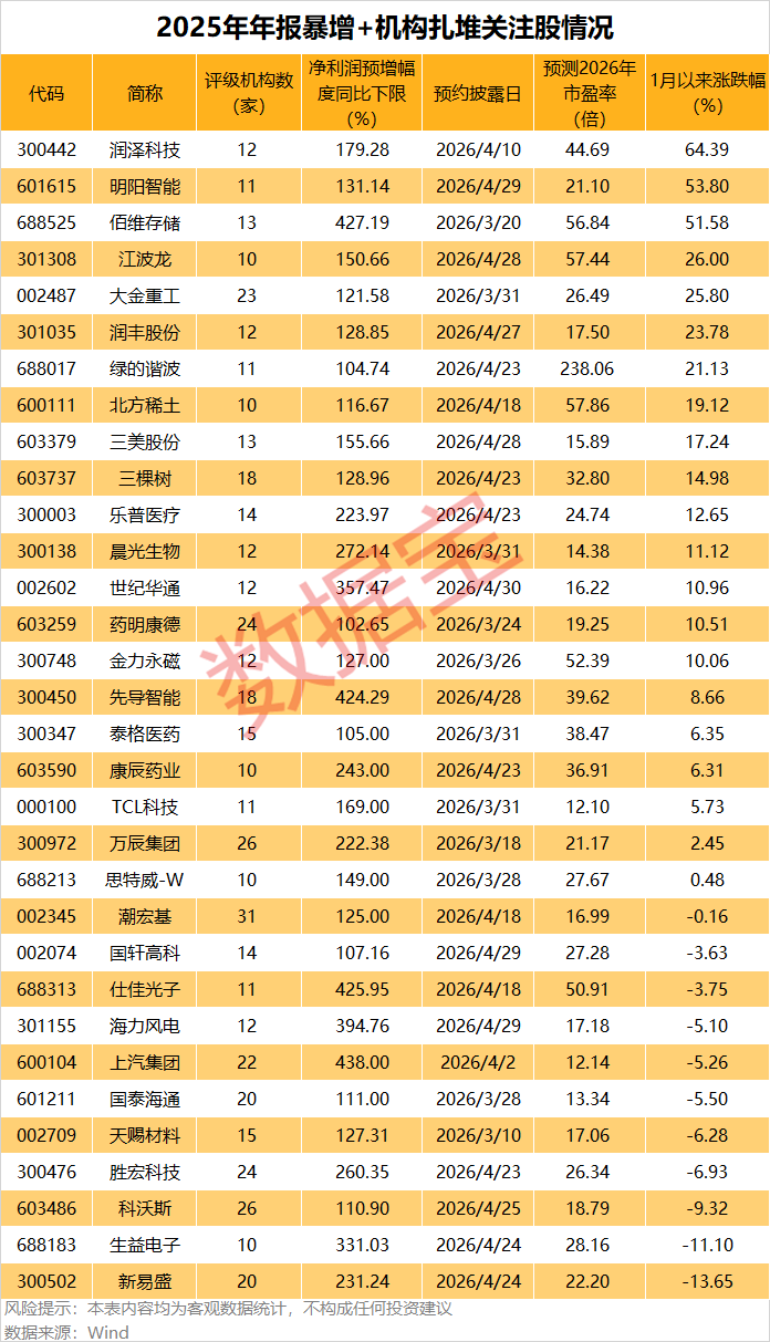 数据宝统计出机构扎堆关注的业绩暴增股,这类股票在年报披露前后的交易性机会或许值得关注。数据显示,合计有32股2025年年报预增同比下限超100%且有10家及以上机构评级。其中,上汽集团、佰维存储、仕佳光子、先导智能等个股预增均超400%。