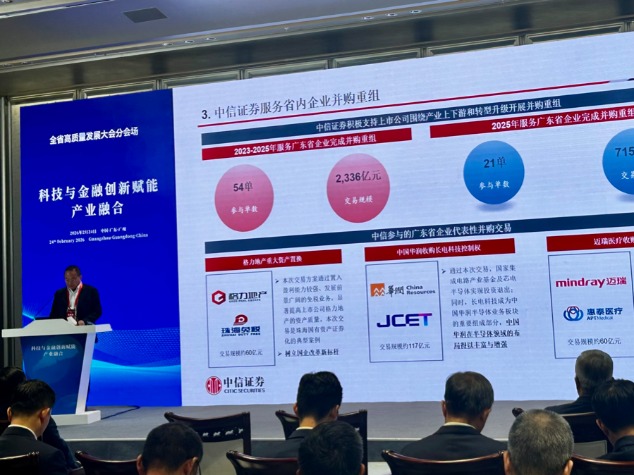 张秀杰表示,中信证券密切跟进政策导向,积极支持广东省企业开展并购重组,助力广东省企业高质量发展。2023至2025年,中信证券累计服务广东省企业完成并购重组54单,交易规模达2336亿元,其中,2025年参与交易21单,规模达715亿元。