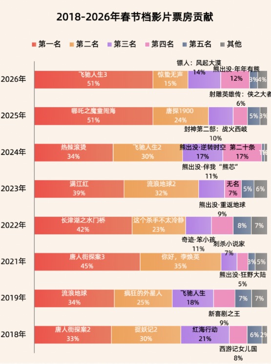 而这一态势也直接催生了今年春节档出现了一个历史性现象:一部影片以50%的票房占比几乎贯穿整个档期。纵览近些年的春节档,即便是去年的《哪吒2》也曾在前期跟《唐探1900》陷入激烈交锋,最终以51%的票房占比拿下票房冠军,而《飞驰人生3》以全程无对手的统治力,刷新了春节档头部影片的领跑纪录。