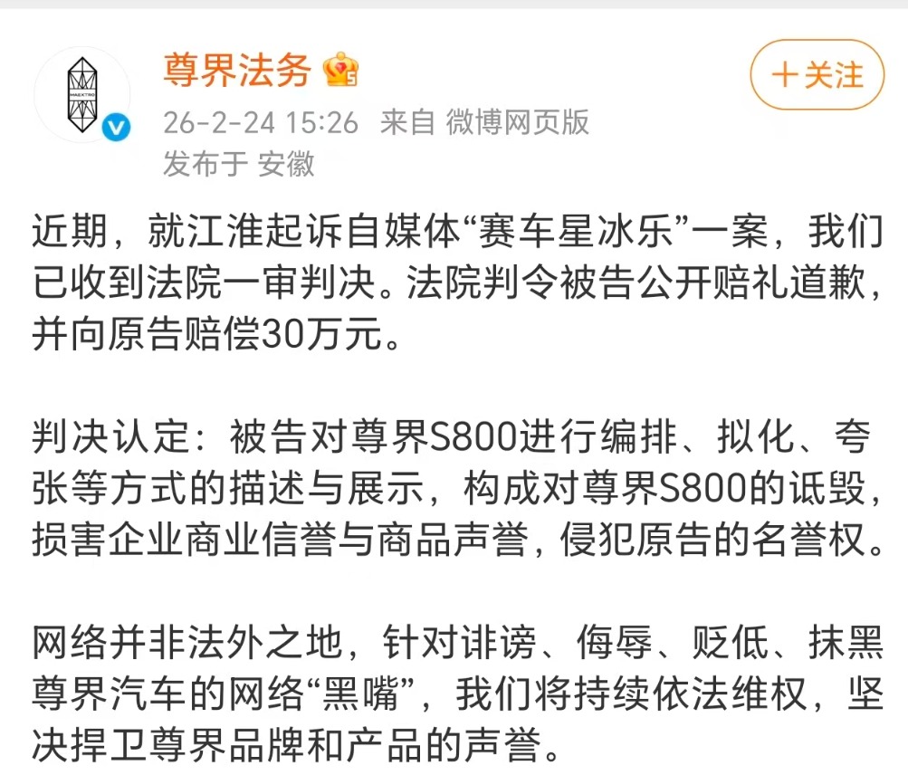 同日,尊界法务也发布声明称,近期,就江淮起诉自媒体“赛车星冰乐”一案,公司已收到法院一审判决。法院判令被告公开赔礼道歉,并向原告赔偿30万元。判决认定:被告对尊界S800进行编排、拟化、夸张等方式的描述与展示,构成对尊界S800的诋毁,损害企业商业信誉与商品声誉,侵犯原告的名誉权。