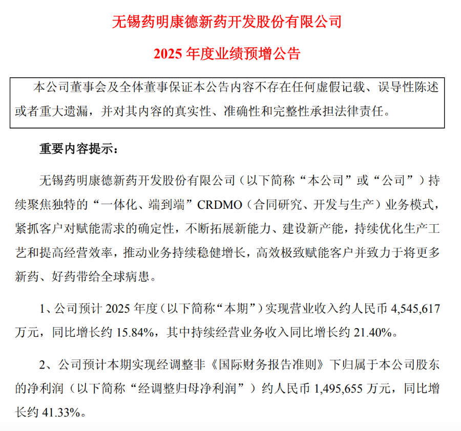 作为CXO龙头,药明康德的表现无疑是行业景气度的风向标:在2023年-2024年连续两年增长放缓后,药明康德2025年逆势突围,预计实现营收约454.6亿元,同比增长约15.8%,归母净利润约191.5亿元,同比增长约102.6%。这一表现,也将创下公司上市以来归母净利润的历史新高。