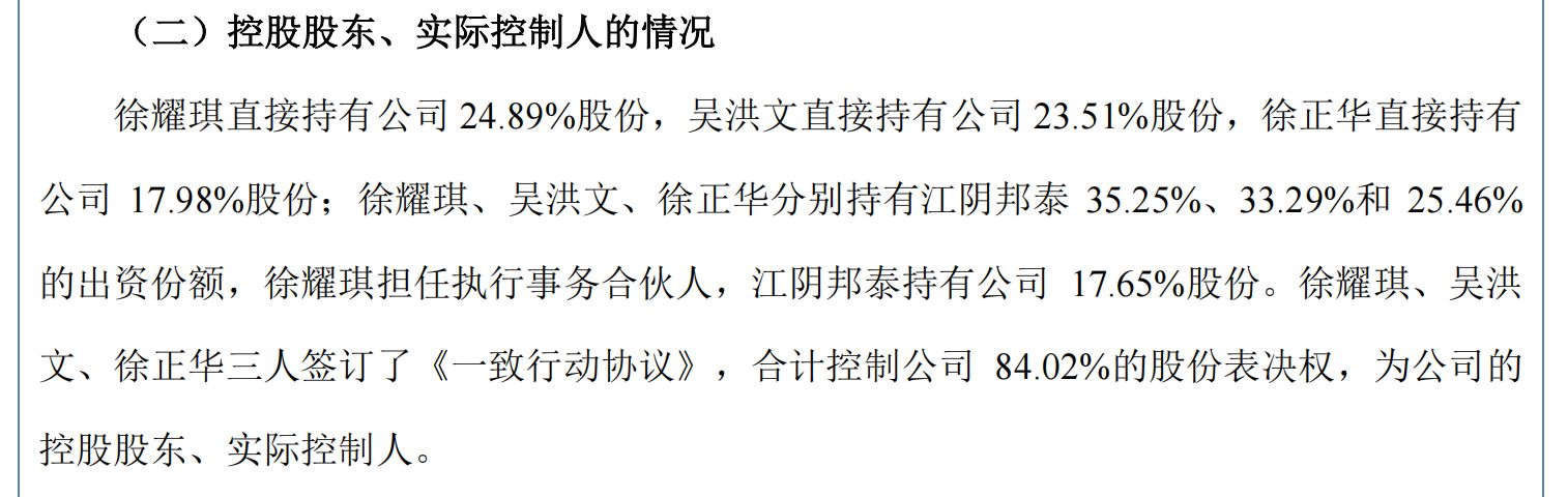 邦特科技的股权结构印证了这段创业同盟。截至目前,徐耀琪直接持有24.89%的股份,吴洪文持股23.51%,徐正华持股17.98%。此外,三人还通过持股平台江阴邦泰科技咨询合伙企业(有限合伙)间接控制公司17.65%的股份,徐耀琪担任执行事务合伙人。