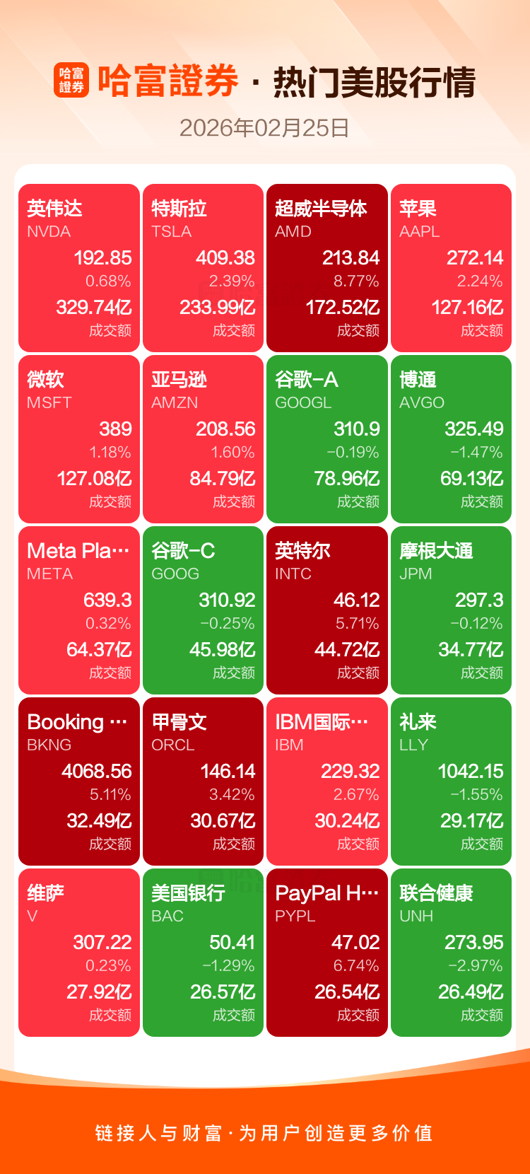 英伟达涨0.68%,特斯拉涨2.39%,超威半导体涨8.77%,苹果涨2.24%,微软涨1.18%,亚马逊涨1.60%,谷歌-A跌0.19%,博通跌1.47%,Meta Platforms Inc-A涨0.32%,谷歌-C跌0.25%。