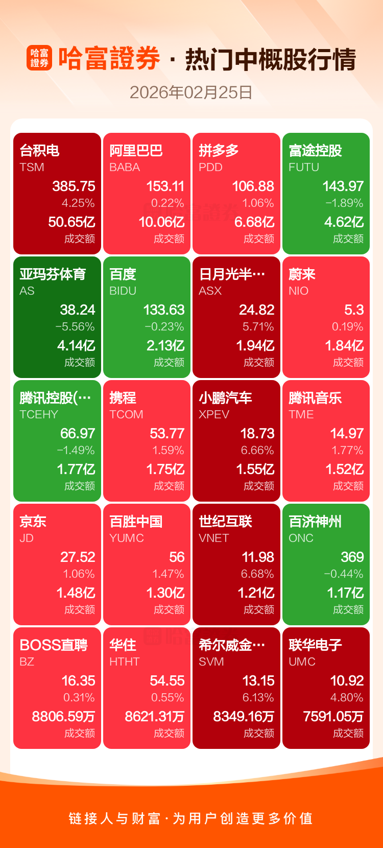 台积电涨4.25%,阿里巴巴涨0.22%,拼多多涨1.06%,富途控股跌1.89%,亚玛芬体育跌5.56%,百度跌0.23%,日月光半导体涨5.71%,蔚来涨0.19%,腾讯控股(ADR)跌1.49%,携程涨1.59%。