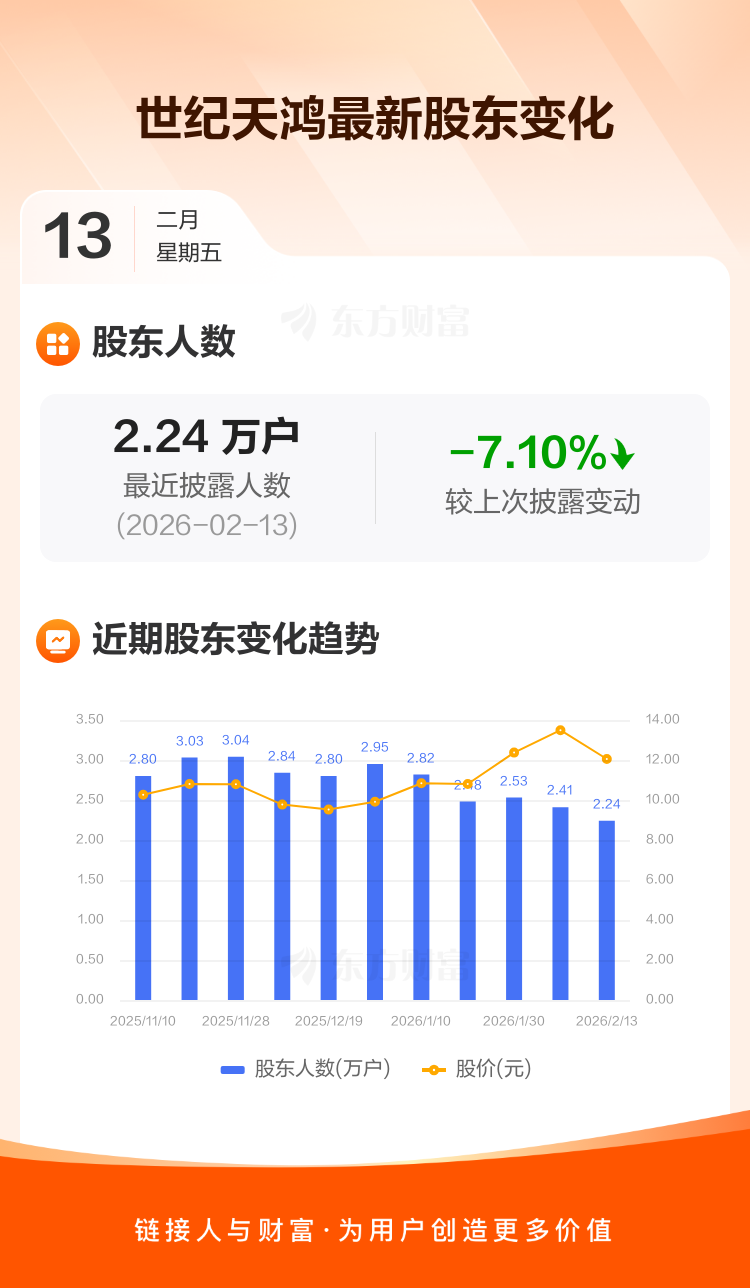 世纪天鸿最新披露数据显示,截至2月13日公司股东户数为2.24万户,较上期(2026年2月10日)减少1714户,降幅为7.10%。户均持有流通股数量由上期的1.46万股上升至1.57万股,户均持股金额由上期的19.68万元减少至18.93万元。
