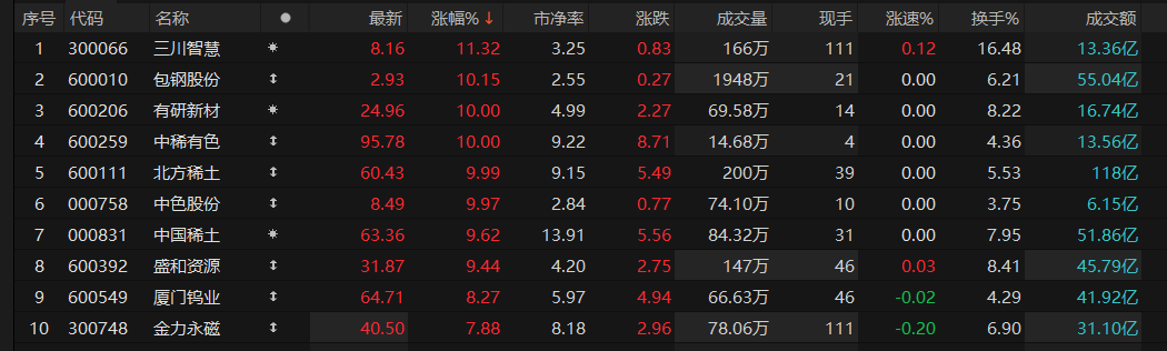 2月25日,午后稀土永磁概念再度拉升,盛和资源涨停,续创历史新高,此前北方稀土、中稀有色、中色股份、包钢股份涨停,中国稀土触及涨停,金力永磁、厦门钨业、正海磁材、华宏科技等跟涨。