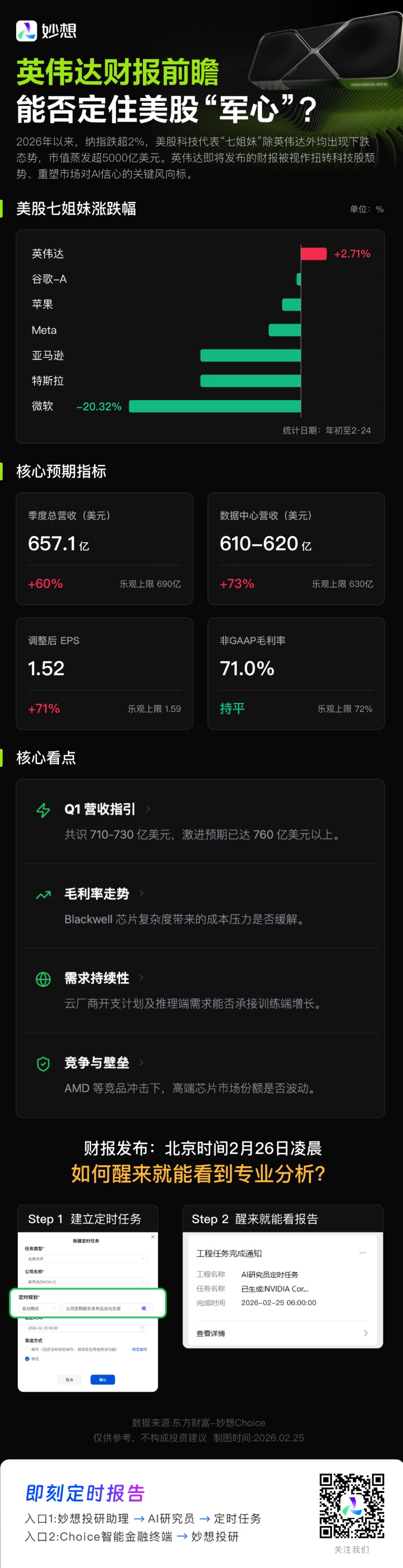市场对英伟达的业绩预期依然强劲。季度总营收预计达 657亿美元,同比增长60%;作为增长引擎的数据中心业务,营收预期在 610-620 亿美元区间,同比增速高达 73%;调整后 EPS 预计为 1.52 美元,同比增长 71%。尽管毛利率预期维持在 71%,与上一季度持平,但其能否在 Blackwell芯片量产带来的成本压力下保持韧性,仍是市场关注的焦点。