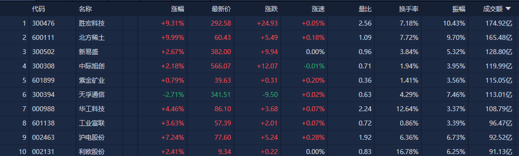 个股方面,全天成交额最高的是胜宏科技,达174.92亿元。北方稀土、新易盛、中际旭创等个股成交额靠前。