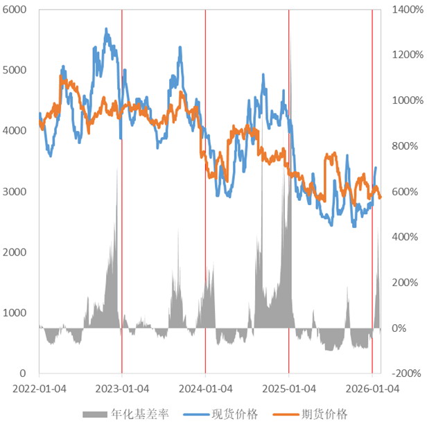 第二,春节、中秋节前后基差“先涨后跌”的季节性规律显著。节前,食品厂需求集中释放推高现货价格,而期货市场受节后消费预期影响,价格未同步上行,形成基差扩张格局;节后,消费突然断档,而节日期间被压制的出栏需求集中释放,现货价格快速回调,期货价格因远月预期修复而相对坚挺,基差迅速收窄。