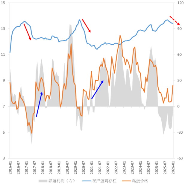 当前,蛋鸡养殖行业处于由产能出清期向行业回暖期过渡的关键阶段。该阶段的典型特征为行业产能持续去化,同时养殖利润逐步回升。自2017年起,我国蛋鸡养殖业先后经历了两轮明显的回暖周期,分别发生于2017年下半年与2021年上半年,这两次回暖均出现在前期产能深度去化之后。值得注意的是,最新一轮产能去化于2025年10月启动,而当前产业规模化水平已处于历史高位,这一结构性变化使得本轮产能去化呈现渐进式特征,并可能在一定程度上削弱其对蛋价上涨的推动效应。