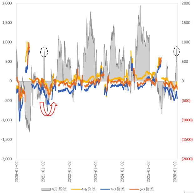 第一,基差 “尖顶圆底”走势明显。“圆底”源于养殖成本支撑,过程漫长且反复;“尖顶”则受供需矛盾缓解与远期预期压制,转折快速而明确。