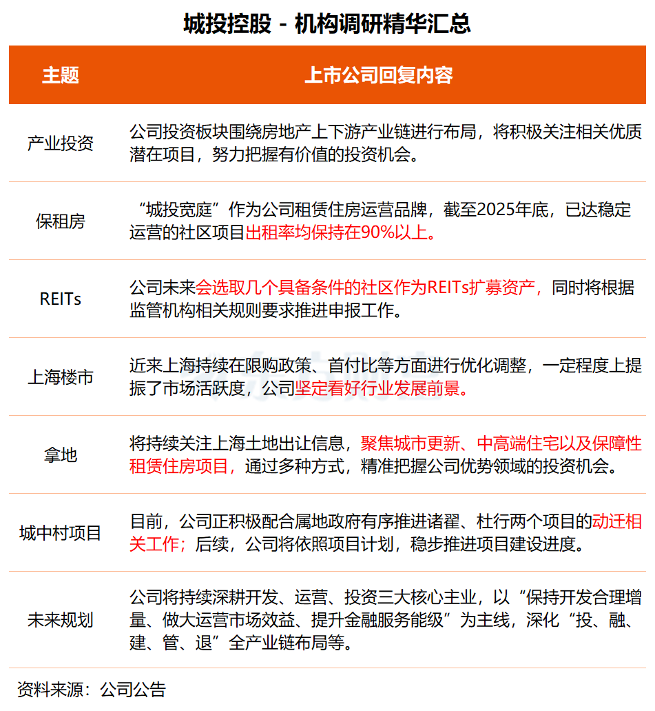 城投控股表示,公司将持续关注上海土地出让信息,聚焦城市更新、中高端住宅以及保障性租赁住房项目,通过集中供地、城市更新、产城融合、片区建设以及收并购等方式,精准把握公司优势领域的投资机会。