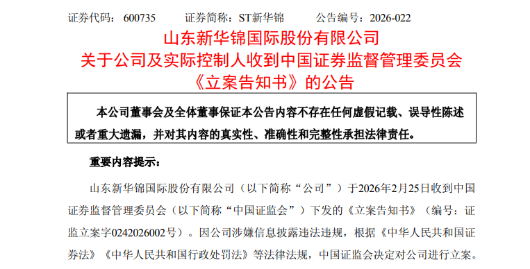 2月25日晚,ST新华锦(600735)发布公告称,公司及实际控制人张建华于当日收到中国证监会《立案告知书》,因涉嫌信息披露违法违规,证监会决定对公司及实际控制人分别立案调查。同日,该公司同步公告,无法在责令改正期限内完成资金占用整改,公司股票将自26日起停牌。