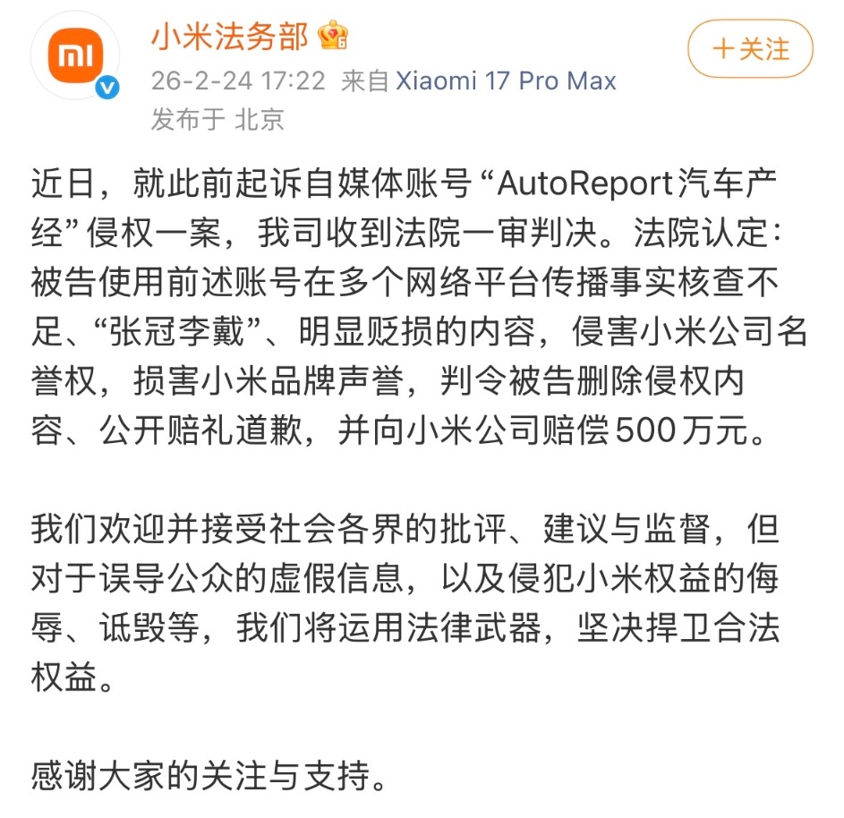 2月24日,小米法务部发文称,近日,就此前起诉自媒体账号“AutoReport汽车产经”侵权一案,公司收到法院一审判决。法院认定:被告使用前述账号在多个网络平台传播事实核查不足、“张冠李戴”、明显贬损的内容,侵害小米公司名誉权,损害小米品牌声誉,判令被告删除侵权内容、公开赔礼道歉,并向小米公司赔偿500万元。