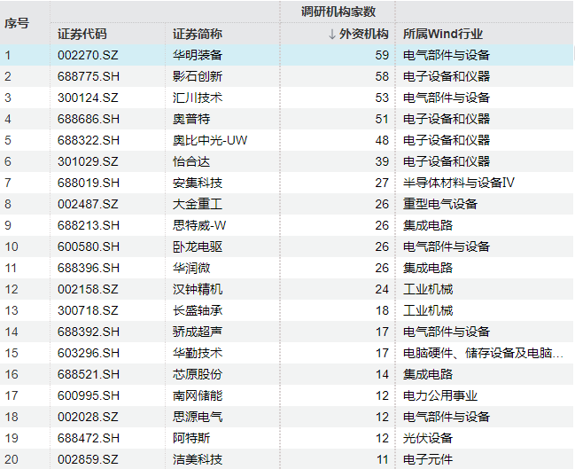 从调研个股来看,今年以来截至2月25日,华明装备获得59家外资机构调研,在所有个股中排名首位;影石创新、汇川技术、奥普特也均获得50家以上外资机构调研。此外,怡合达、安集科技、大金重工、思特威、卧龙电驱、华润微等个股获得20家以上外资机构调研。