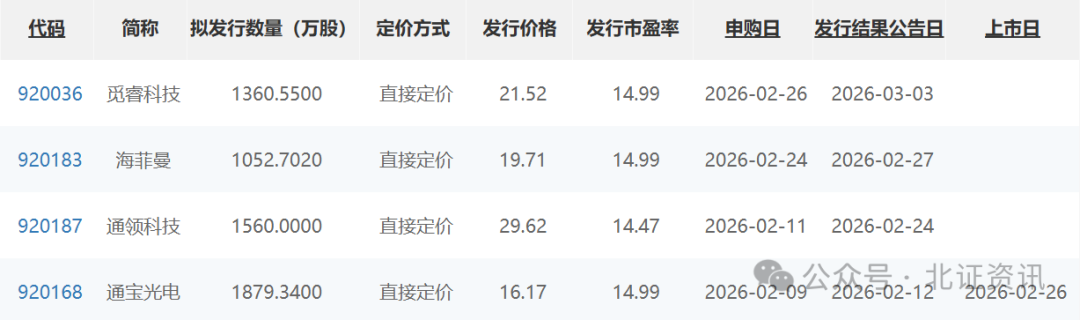除海菲曼外,北交所还有3只新股处于发行状态,其中觅睿科技将于2月26日开启申购,通领科技已公布发行结果,通宝光电定于2月26日正式登陆北交所,是北交所马年第一只上市的新股。从发行节奏看,北交所马年新股发行呈现“稳中有进”的态势,发行市盈率普遍维持在14—15倍区间,低于行业平均水平,为投资者提供了较为合理的估值空间。