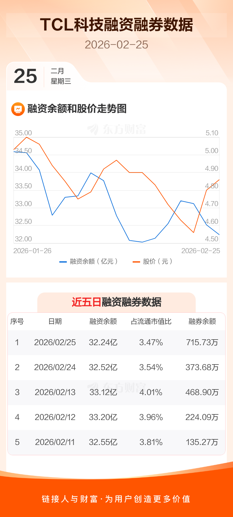 交易所最新数据显示,TCL科技于2026年2月25日获融资买入2.03亿元,融资偿还2.31亿元,当日融资净偿还2815.98万元。目前,该股融资余额32.24亿,占流通市值比例为3.47%。
