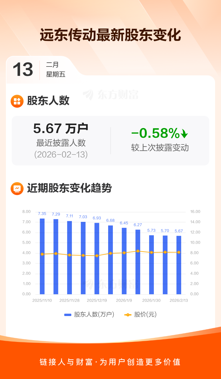 远东传动最新披露数据显示,截至2月13日公司股东户数为5.67万户,较上期(2026年2月10日)减少329户,降幅为0.58%。户均持有流通股数量为1.06万股,与上期基本持平,户均持股金额由上期的8.63万元增加至8.65万元。